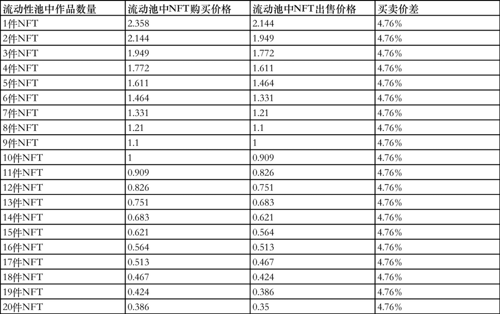 因此,在池中还有10个NFT时,购买价格为1ETH,即便池中只剩2个NFT时,购买价格也仅上升至 2.144 ETH,相较前述范例的50ETH下降许多,该模型相对于传统 AMM,提供了更窄的价格波动范围(流动性池中 NFT 购买价格最高 2.358,最低则为 0.386,整体价格波动控制在 2 以内),也更适用于有限的 NFT 市场交易。