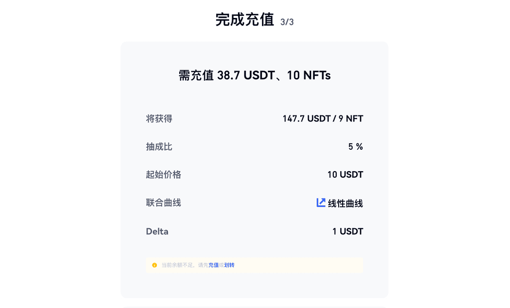 最后一个步骤为选择要添加至流动性池中的 NFT,并确认参数设定是否正确,作品及资金充值完成后便创建成功。