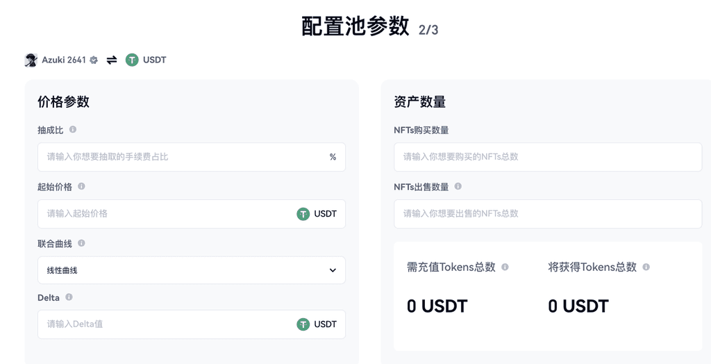 左半边是价格参数的设定,合理的参数设定是流动性池的关键;右半边则是设定买入及卖出的上限,协议会帮你计算出需要存入的 NFT 及代币数量,并可通过下方价格曲线来查看交易所需的成本及收益。