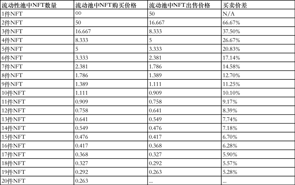 在经过多次买卖后,假如流动性池中的 NFT 过多或过少,价格将有严重落差。在池中还有 10 个 NFT 时,购买价格为 1.111 ETH,但当池中只剩 2 个 NFT 时,购买价格飙升至 50 ETH。