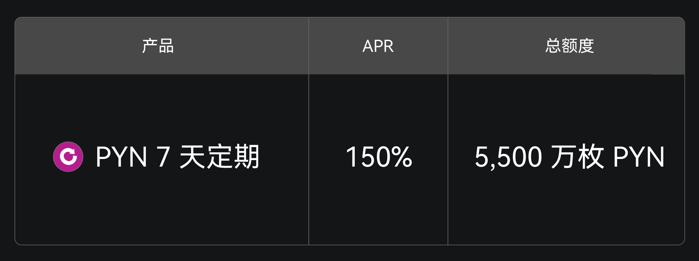 Gate 余币宝现已推出 PYN 7 天定期理财,年化收益 150%,总额度 5,500 万枚 PYN,限量发售,先到先得。