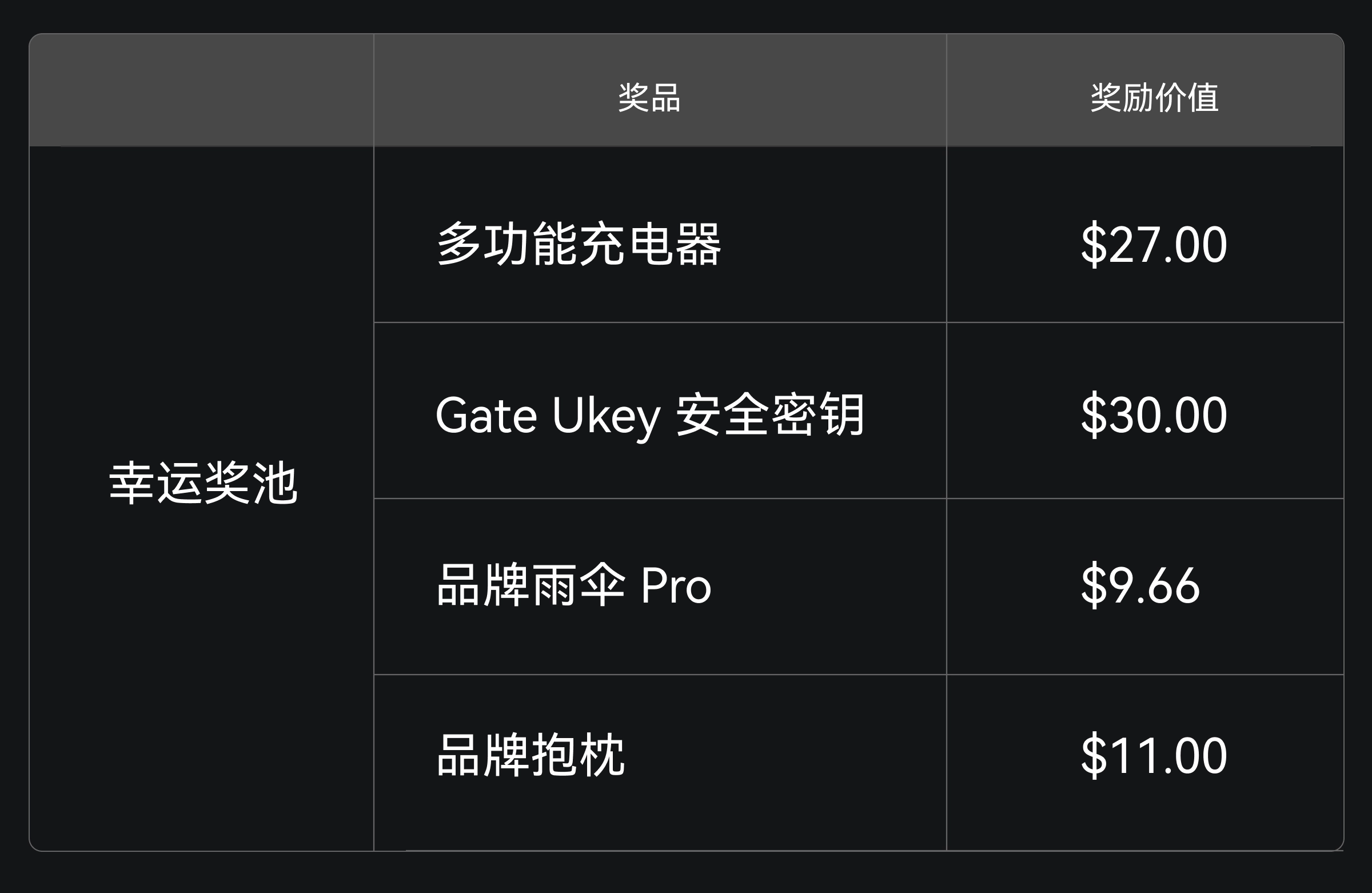 - 周边奖励以空投形式发放(空投有效期 30 天),若抽中周边奖励,请前往 Gate 商城填写收货地址,过期未填写将视为自动放弃获奖资格,不予补发。若因物流原因导致周边奖励无法送达,周边奖励将以等值合约体验券形式发放;