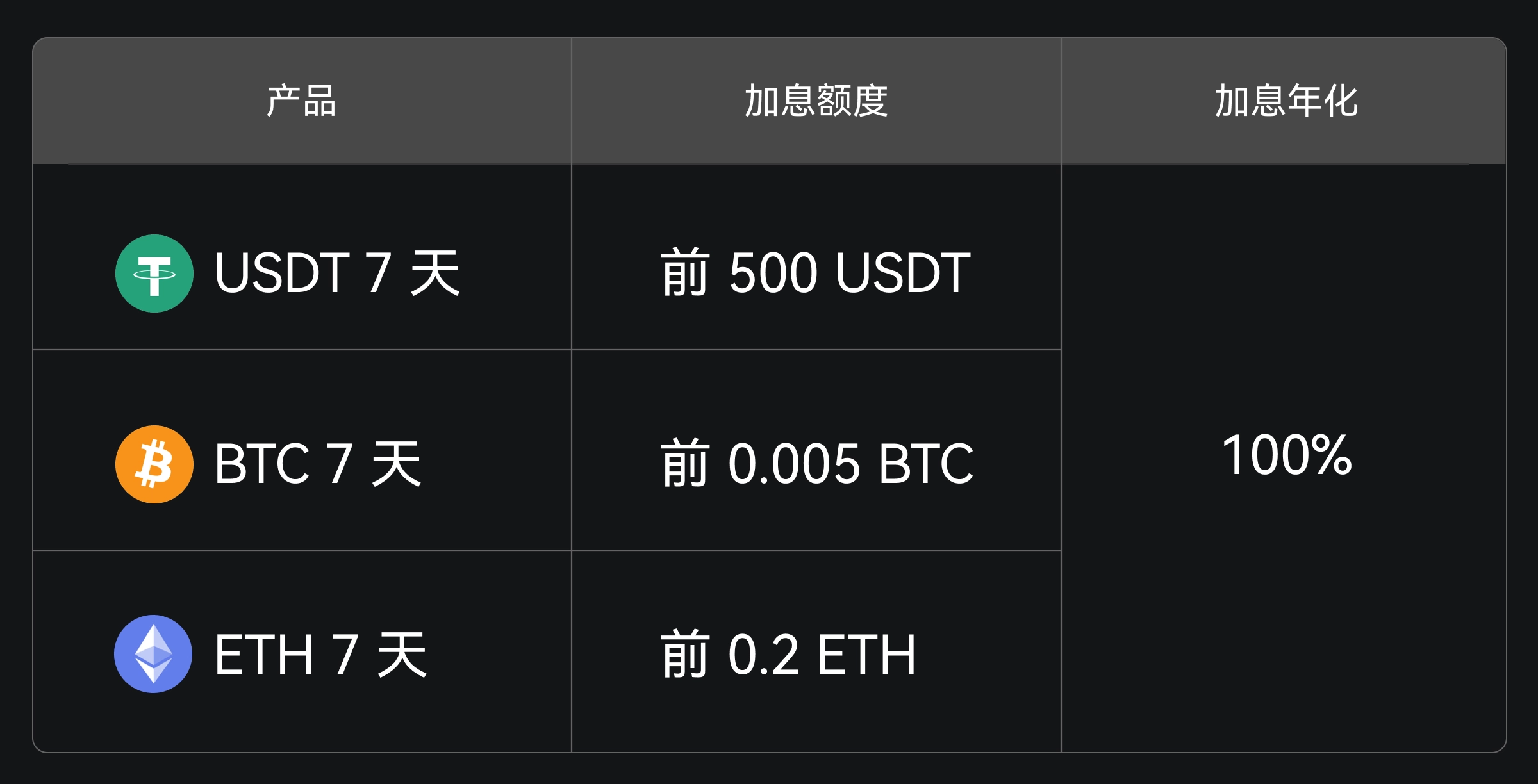 - 如您申购 USDT 7 天定期理财的金额为 3,000 USDT,除产品基础的年化收益率 2.5% 外,前 500 USDT 将额外享有 100% 年化的加息奖励 。BTC 和 ETH 同样适用此计算方式。