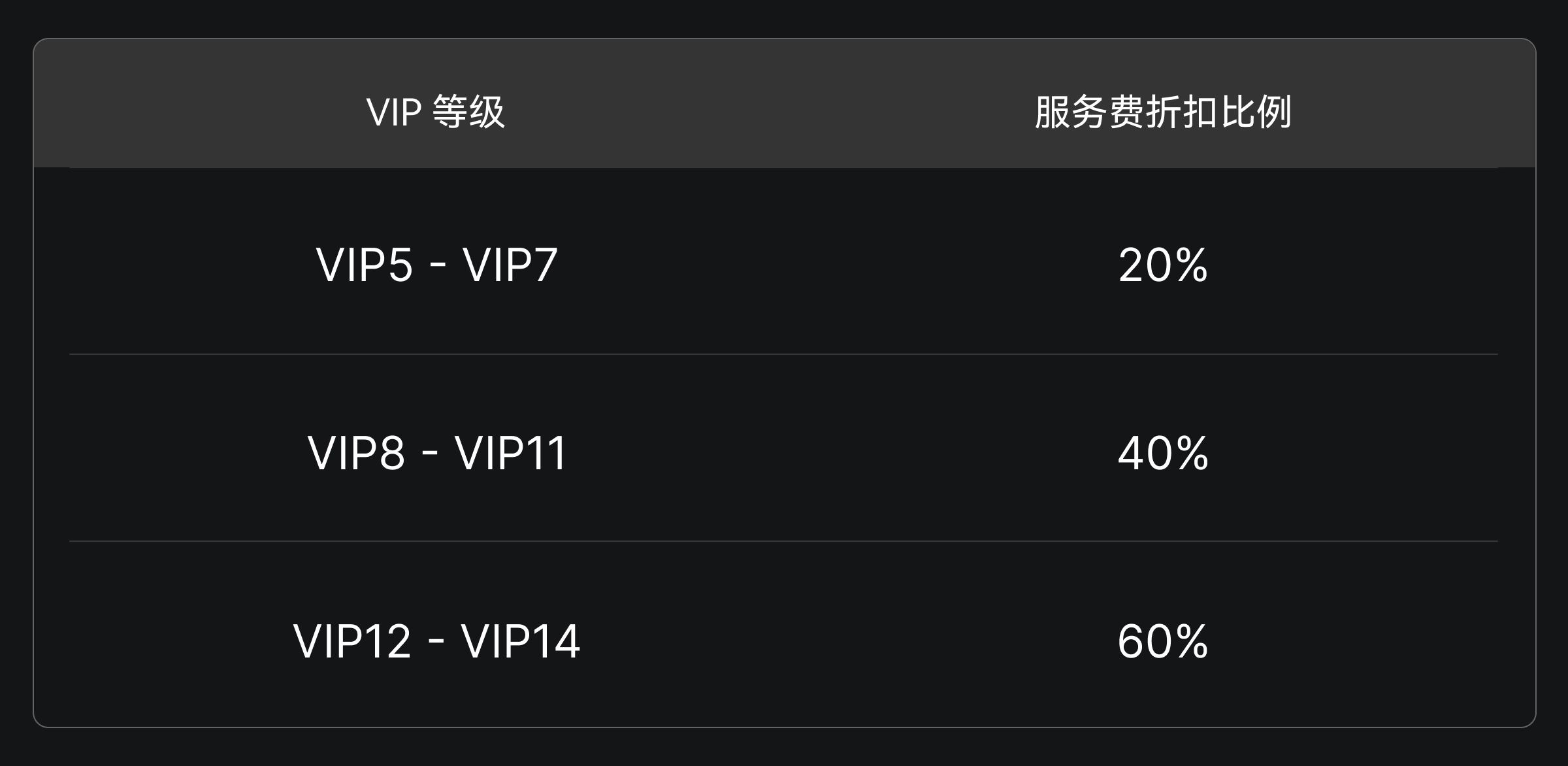 - 请关注您的账户等级变动,VIP 等级提升或下降时,服务费折扣比例将实时更新。