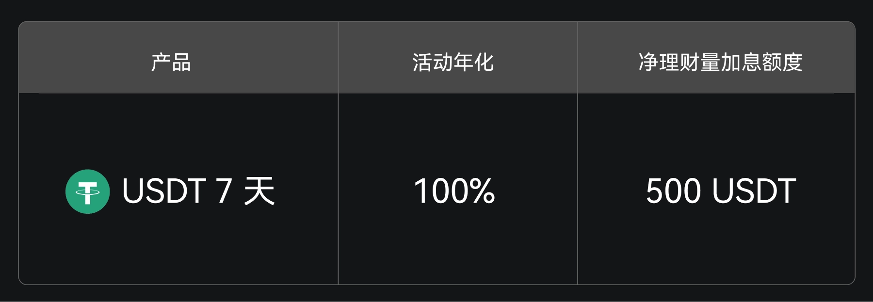- 活动奖励 = USDT 7 天净理财量 × 87.5% / 365 × 7 ,当前 USDT 7 天产品基础年化 + 额外奖励年化=12.5%。(数据更新于 2025 年 5 月 15 日,实际产品利率以申购页面显示为准)
