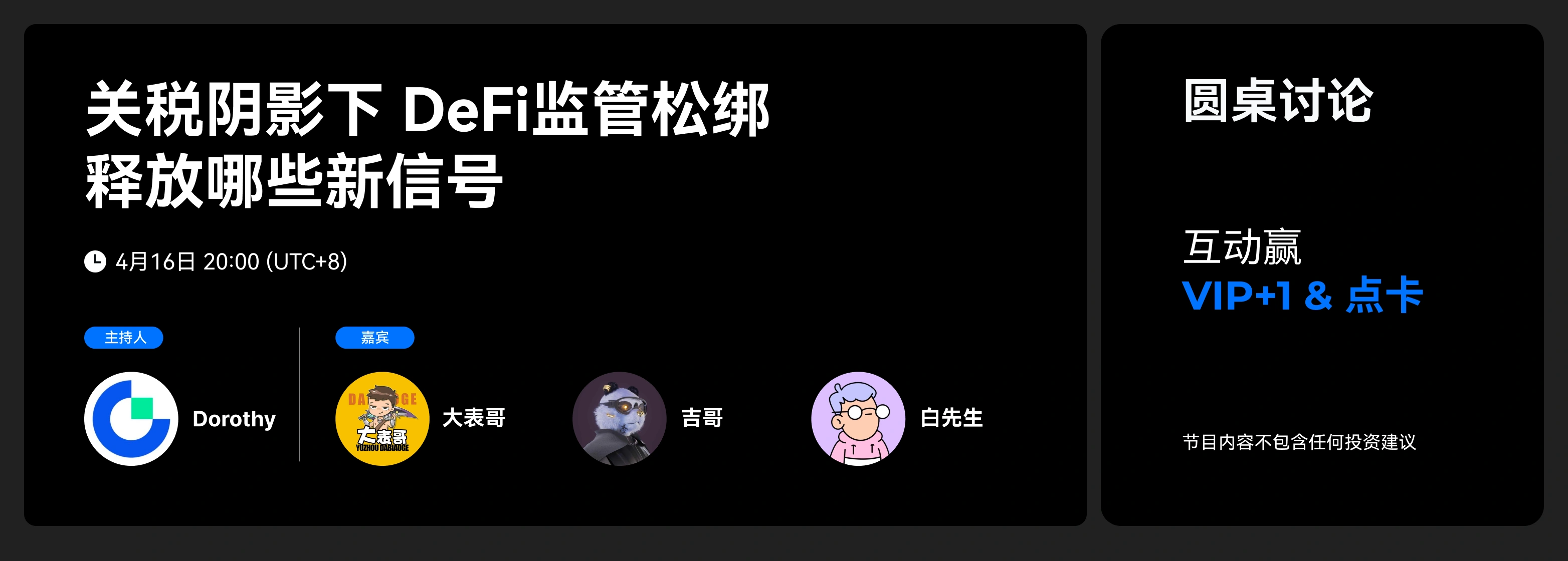 GateLive将于 4月16日 20:00(UTC+8)举办直播栏目《圆桌讨论》。我们将邀请三位区块链研究员,共同探讨关税阴影下,DeFi监管松绑对加密市场的潜在影响及投资者应对策略。观看直播,直播间免费领空投: