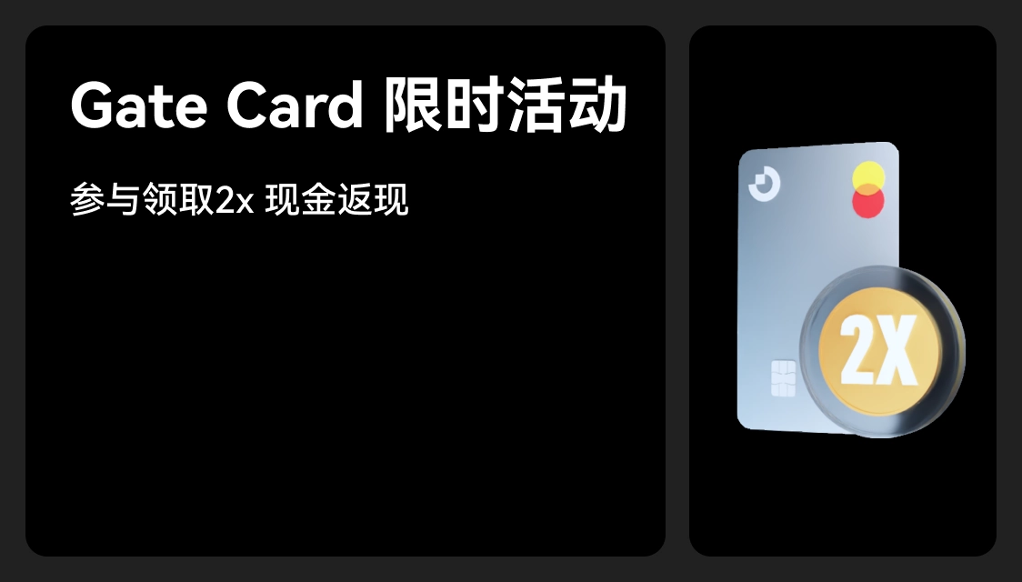活动内容:活动期间,首次申请 Gate Card 并完成任意金额消费,即可领取 2 倍现金返现 ,