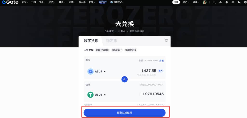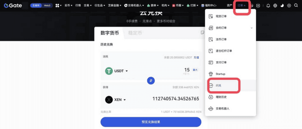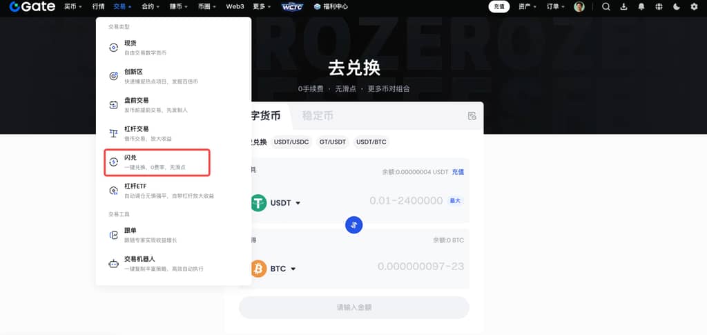 1、登录Gate个人账户,点击导航栏“交易”—“闪兑”。