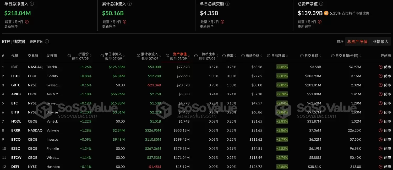 huangt 消息,根据 SoSoValue 数据,昨日(美东时间 7 月 9 日)比特币现货 ETF 总净流入 2.18 亿美元。
