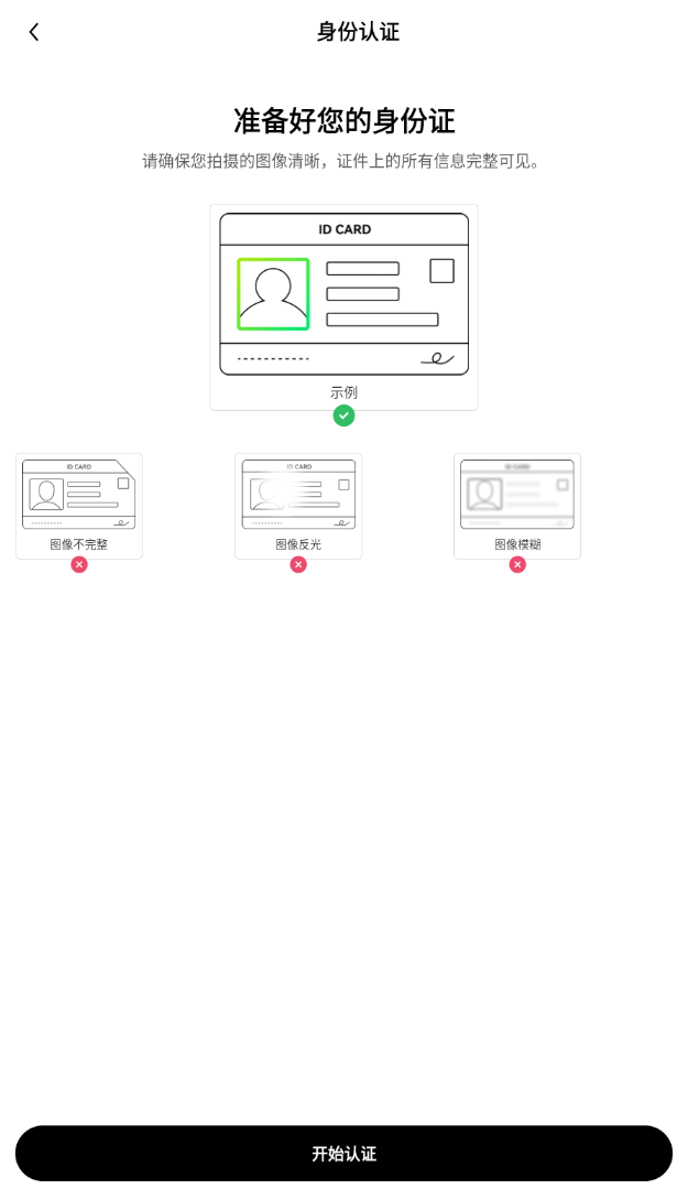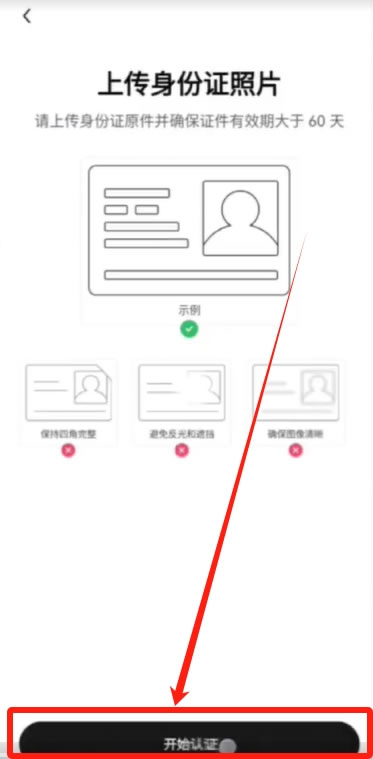接下来我们需要上传我们的证件照片,并且这个证件的有效期要大于60天。确认无误之后,点击【开始认证】。