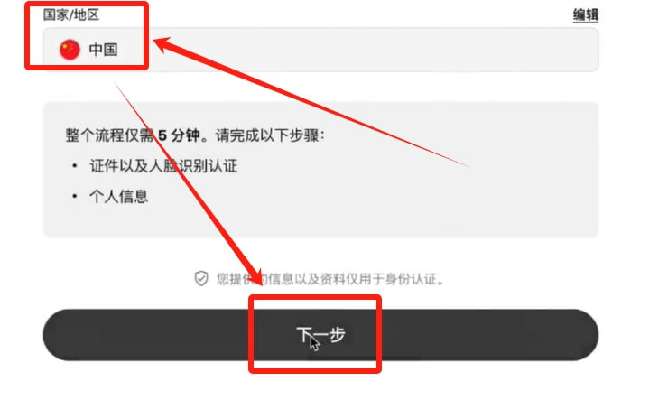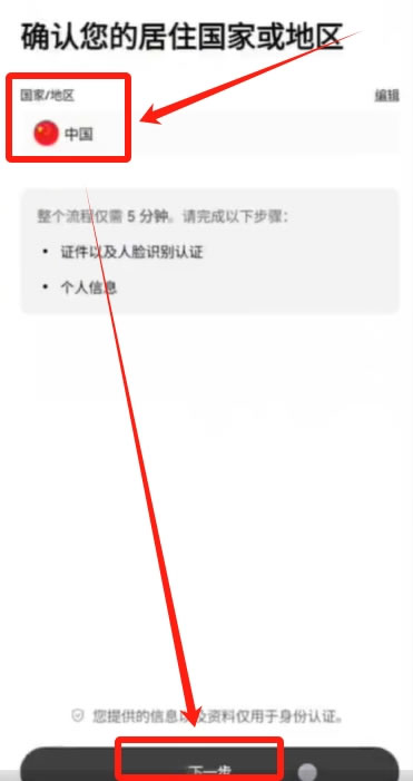 第一步我们首先要二次确认一下目前的居住国家和地区,目前默认的选择是中国,确认无误之后,我们点击【下一步】。