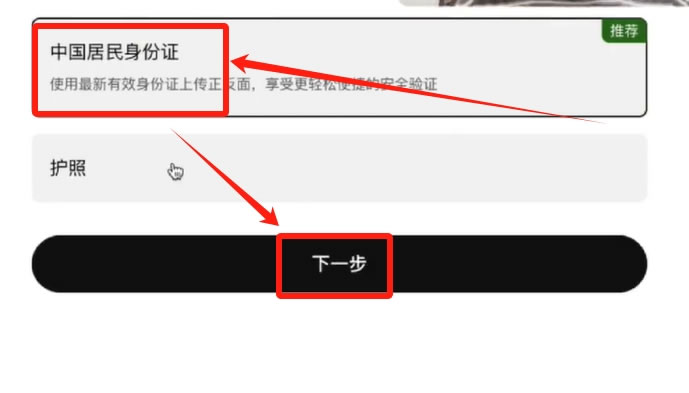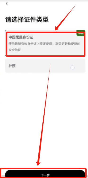 接下来它让我们选择进行身份认证的证件类型,可以选择身份证,也可以选择护照。这里我选择“身份证”,点击【下一步】。