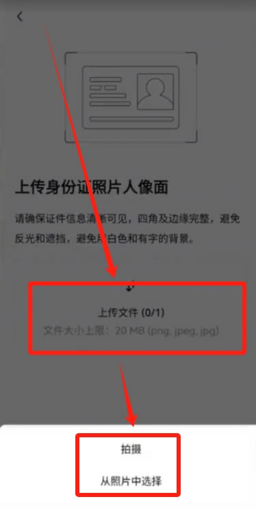 接下来我们只需要点击“上传文件”,我们可以直接拍摄,也可以直接上传我们相册里的照片。我们只需要按照它的提示上传我们身份证正反面,并且需要我们完成人脸识别之后就可以完成身份认证了,非常简单。