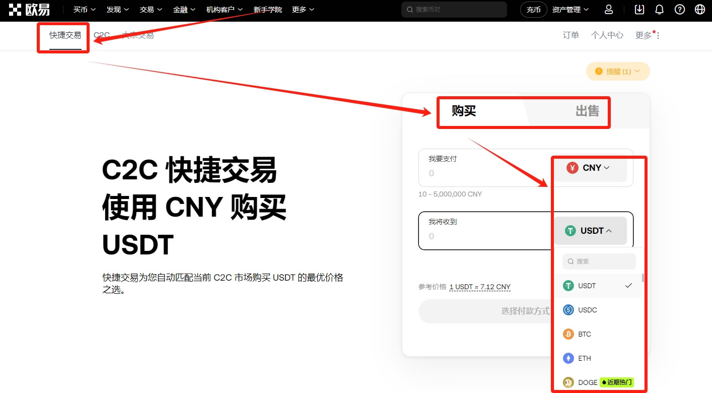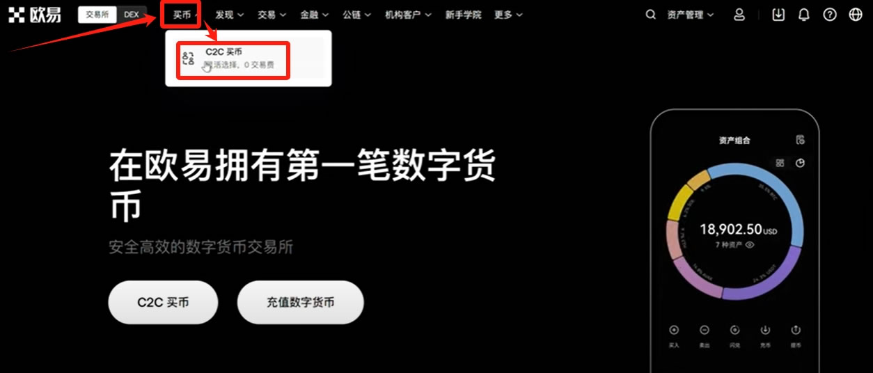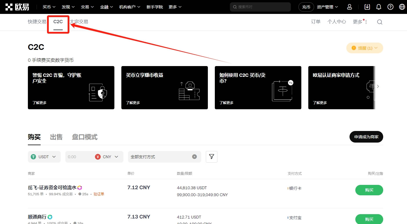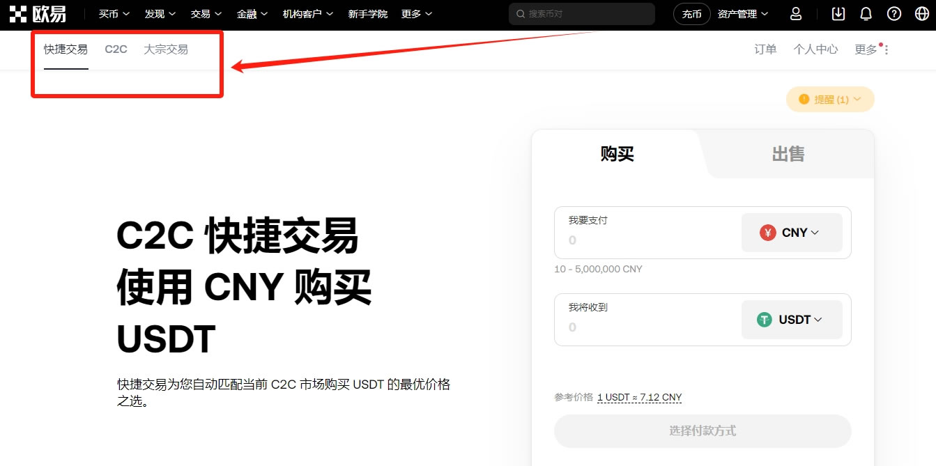 来到欧易交易所的官网,点击左上角的【买币】,这里默认有一个C2C买币,我们点击【C2C买币】。
