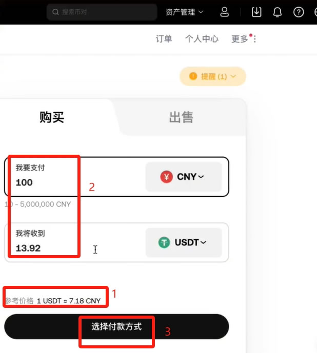 下方是价格参考的汇率,目前1USDT等于7.18人民币。其实我们就可以直接在这里输入100人民币,它就可以帮我们自动计算出对应我们就可以获得13.92颗USDT。如果觉得没有问题,我们就可以点击【选择付款方式】。
