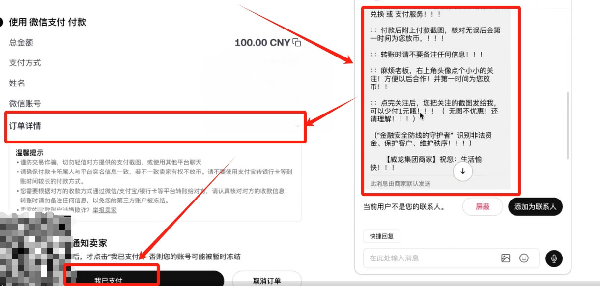 接下来我们就进入到了一个支付页面。我们在这里可以看到,我们需要用微信转账的方式给这个商家进行转款,这个商家叫做“威龙集团”,它给我们发了一些通知,我们只需要按照他的方式在这里去添加这个商家的账号,然后按照他的要求去给他转100块钱。