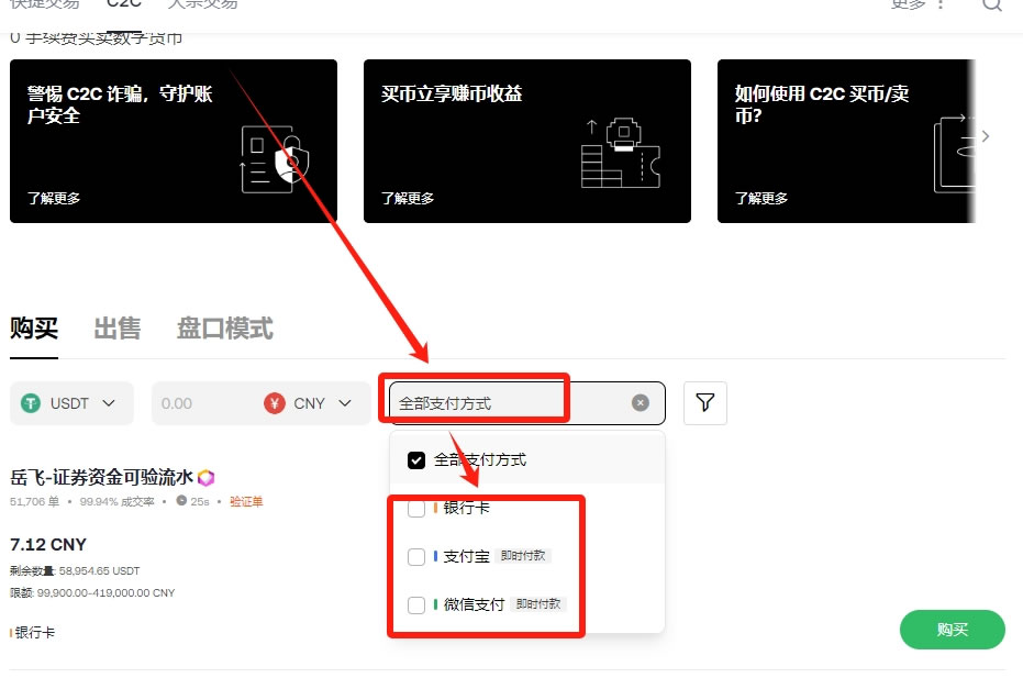 现在我们就进入到了C2C买币的页面。左上角有三个不同的产品,分别是快捷交易、C2C和大宗交易。