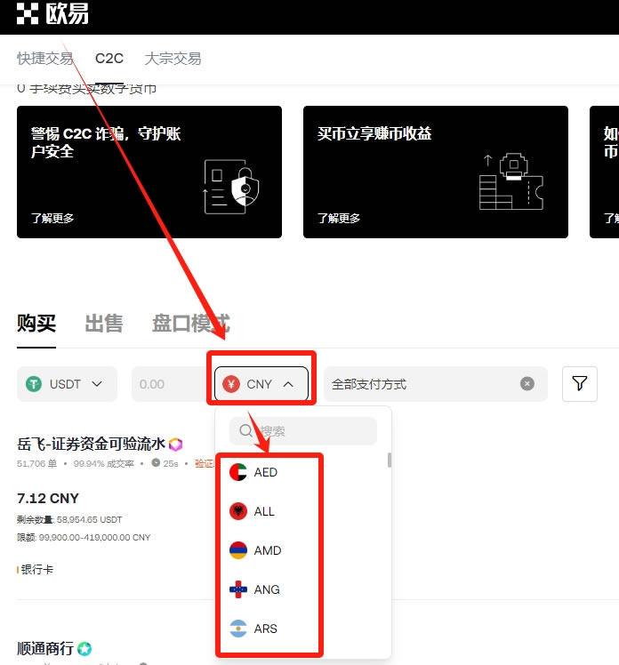 后面默认的选择是CNY人民币,我们点击一下其实也可以看到,欧易交易所支持的其他的法币,但是因为我们的身份认证KYC是中国,所以我们只能使用人民币来去交易。