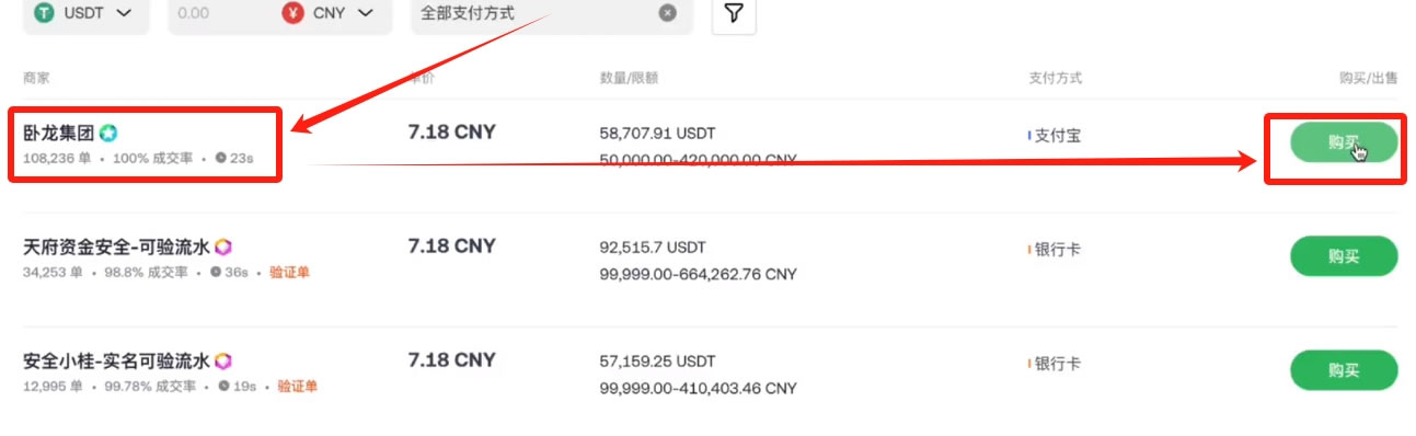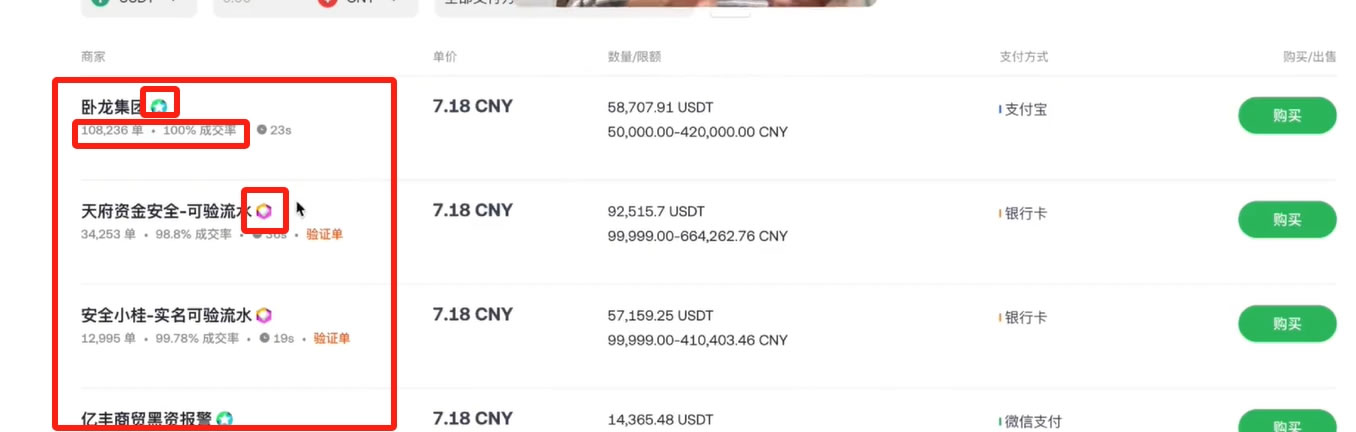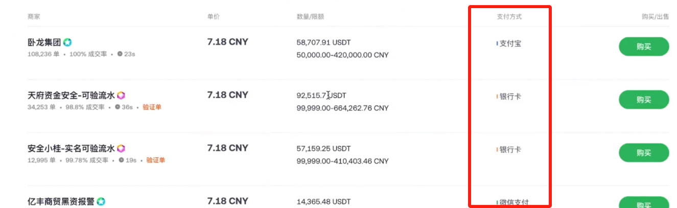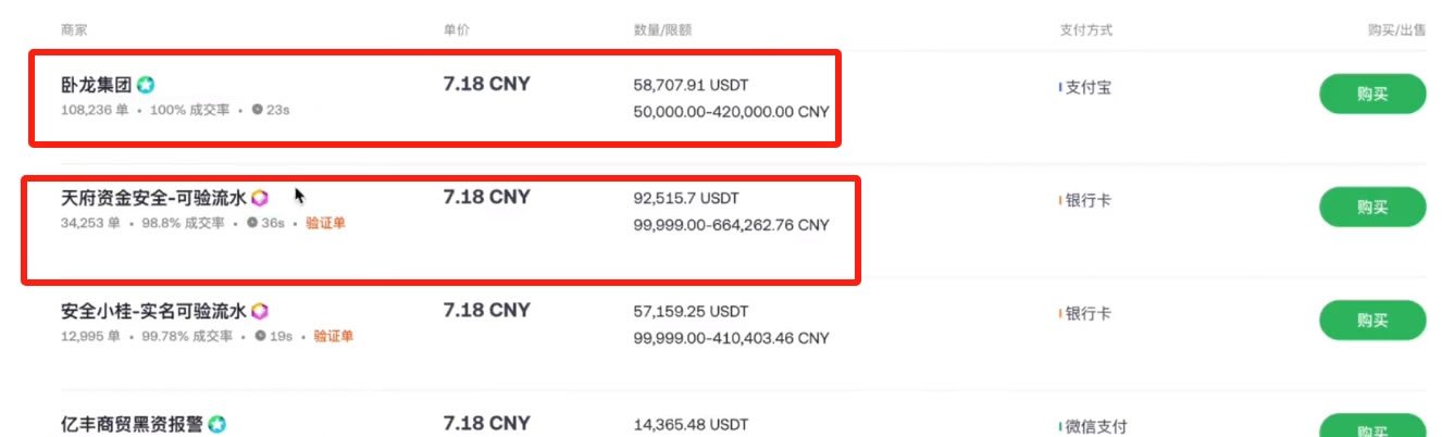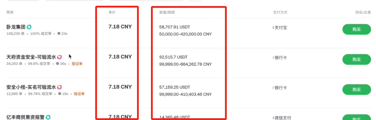 后面是买USDT的单价,目前的单价是7.18人民币。再后面是对应不同商家可以购买的数量和限额。