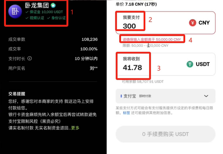 确认这些信息无误之后,我们就可以在右边输入我想购买多少人民币的USDT,例如这里面我输入想要购买300块钱人民币的USDT,对应的我将获得41.78颗USDT。这个时候他提示我,在这个商家他最低有一个购买限额,需要购买50000人民币以上,我没有那么多钱,就切换一个小额商家。