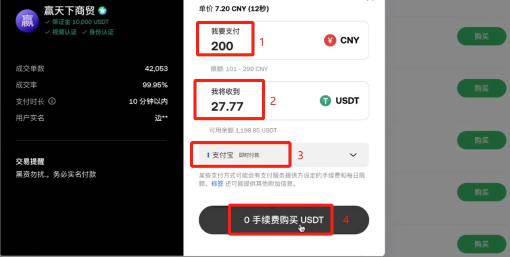 在这里我输入200块钱人民币的USDT,我将收到27.77颗USDT。我可以直接使用支付宝来进行付款,确认无误之后,点击【0手续费购买USDT】。