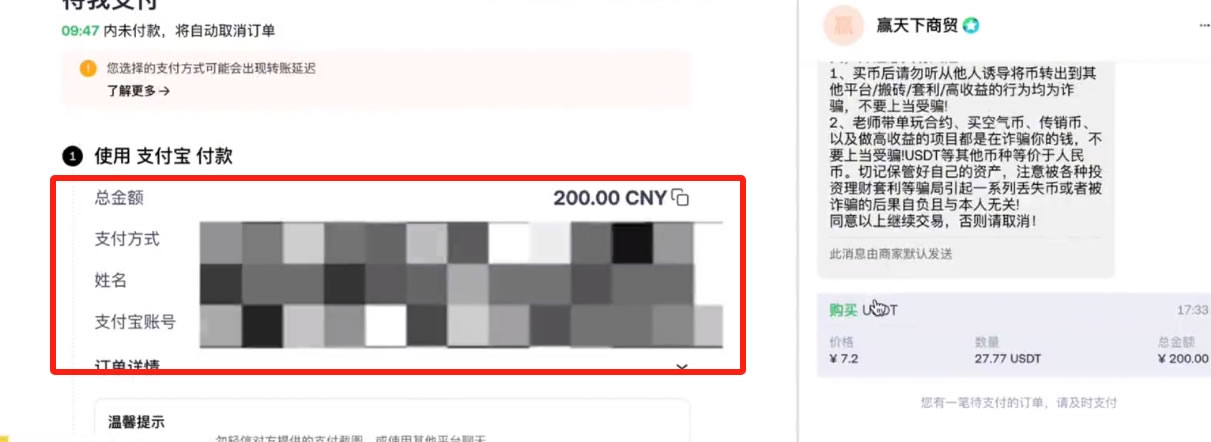 现在我们就进入到了后续的支付页面,我们只需要按照方式往他的支付宝账号里面去转账200块钱,对应的商家收到钱之后,就能够给我们释放USDT了。