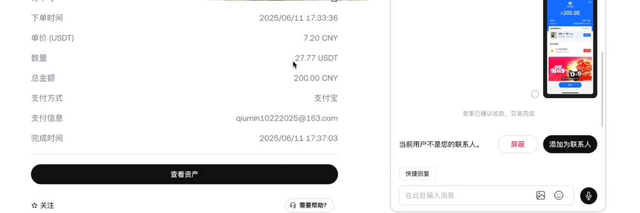 大家可以看到非常快的,目前我就已经完成这笔交易,我成功的使用200人民币购买到27.77颗USDT。