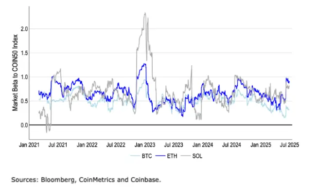 2. ETH 相对于加密货币市场的贝塔系数非常接近 1