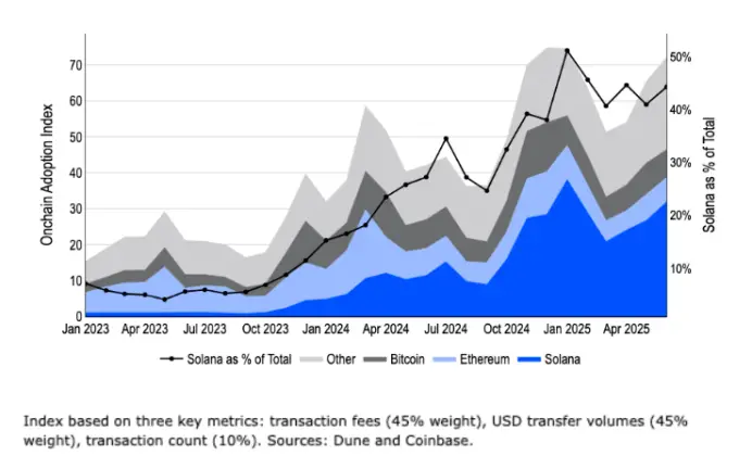 另一方面,Dune Analytics指数显示,自 2024 年第二季度末以来,以太坊在链上活动中的份额持续下滑,而Solana当前占据区块链总活动的44%。图 4 展示了该指数数据,该数据通过跟踪区块链的综合采用情况,结合了三个关键指标:交易费(权重 45%)、美元转账量(权重 45%)和交易数量(权重 10%)。费用和转账的权重更高,因为与交易数量相比,它们更能反映有意义的活动。这一趋势表明,过去一年区块链采用模式已发生根本性转变。