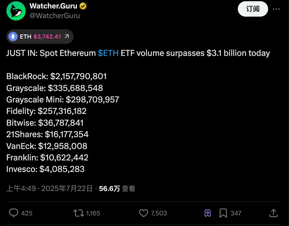 7月22日数据显示,公开市场上各家机构的 ETH现货 ETF 加起来总流入达到31亿美金,在金额的绝对值上显著大于当天排队解质押的 52万个 ETH (19亿美金)。