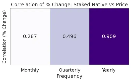 图 8:质押 ETH 与链上价值的月度、季度和年度原生相关性