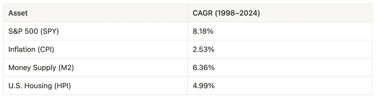 1998 年至 2024 年间,CPI 通胀率平均每年为 2.53%。相比之下,美国 M2 货币供应量年均增速为 6.36%,超过了通胀率和房价,并接近标普 500 指数 8.18%的回报率。这甚至表明,股市的名义增长很大程度上可能更多地源于货币扩张,而非生产率的提高。