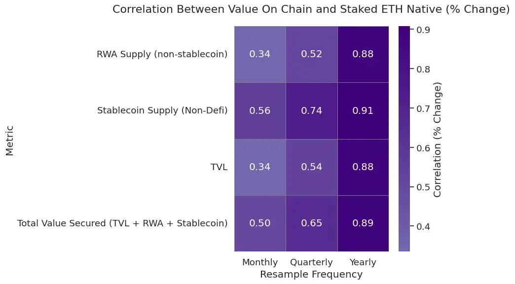 • 链上资产增长与原生 ETH 质押之间的年相关性高达 88% 以上,凸显了强大的经济一致性。