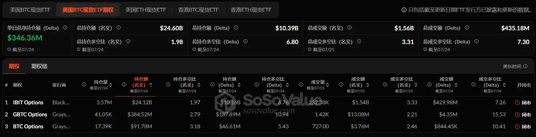 截至 7 月 24 日,美国比特币现货 ETF 期权名义总持仓额达 246.0 亿美元,名义总持仓多空比达 1.98。