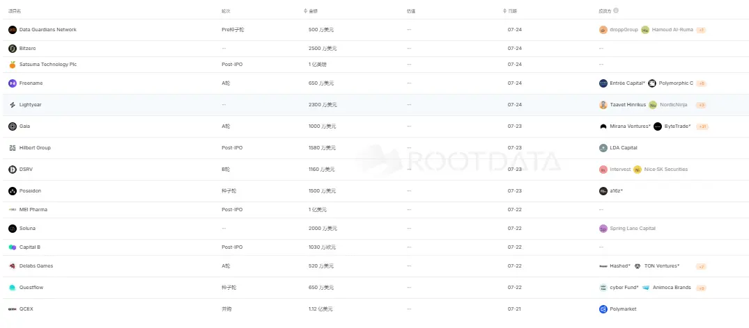 据 RootData 不完全统计,2025 年 7 月 21 日- 7 月 27 日期间,区块链和加密行业共发生 20 起公开投融资事件,累计融资约 5.06 亿美元。