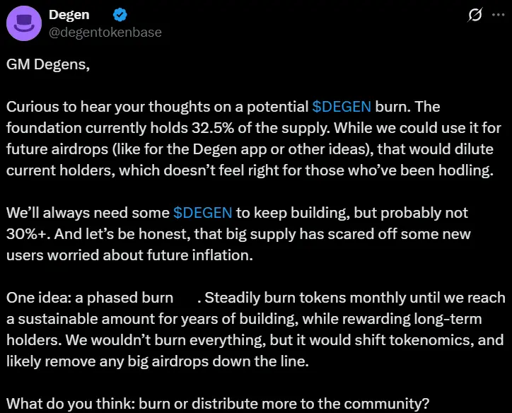 huangt 消息,DEGEN 基金会正在探索分阶段销毁其持有的 32.5% DEGEN 代币总供应量的可能性,以解决代币稀释问题和通胀担忧,并寻求社区意见。该基金会表示,将优先考虑长期可持续性,而非未来的大规模空投。