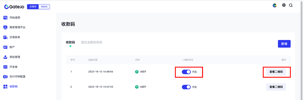 3.3 点击【开启】,点击【查看二维码】。关闭【开启】,则收款码无效。