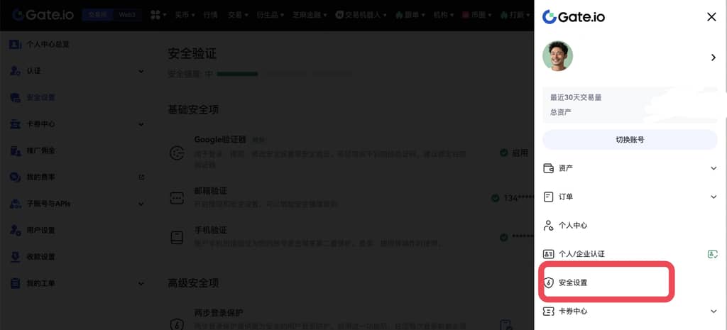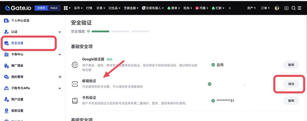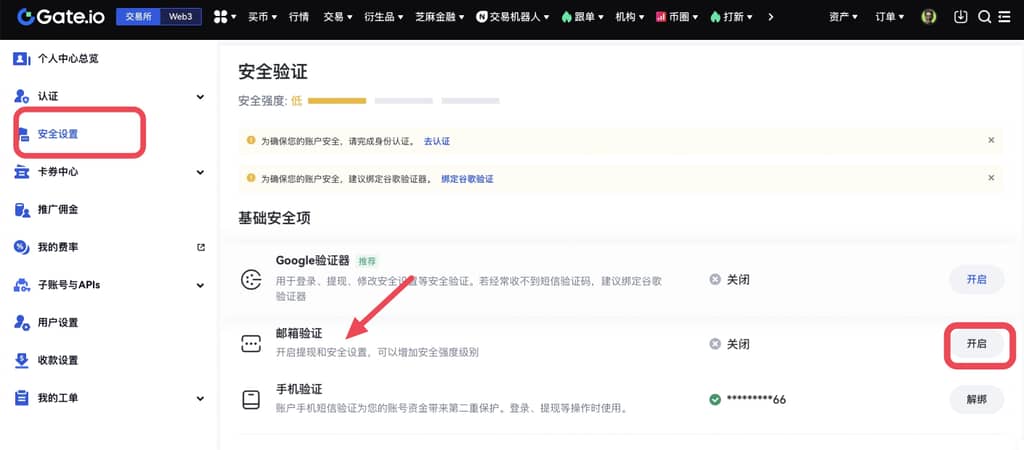 1、登录Gate个人账户,点击右上角“头像”——“安全设置”,在“基础安全项”中找到“邮箱验证”点击“开启”进入邮箱绑定界面。