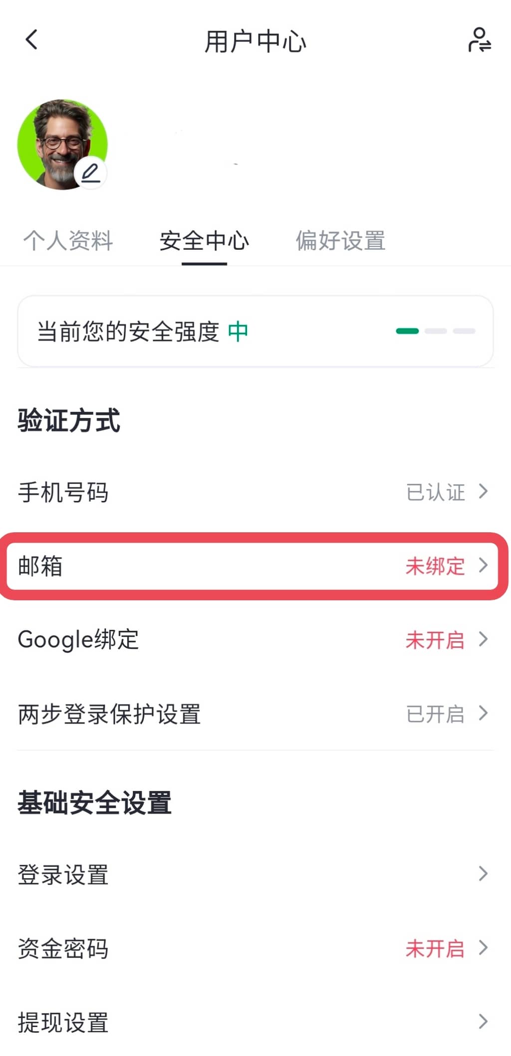 1、打开Gate手机App,登录个人账户——首页点击左上角“头像”,点击头像右侧的右箭头标识,点击“安全中心”——“邮箱”。