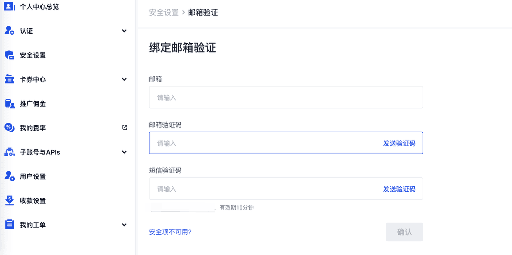 2、填写您的邮箱、邮箱验证码、短信验证码,核实无误后,点击“确认”即可绑定邮箱。