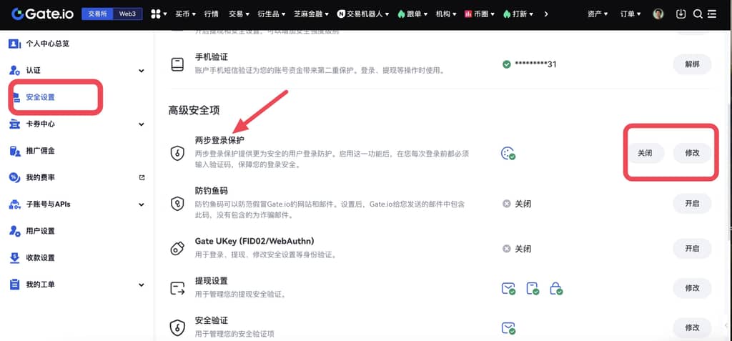 登录Gate个人账户,点击页面右上角“头像”——“安全设置”,在“高级安全项”的“两步登录保护”,点击“开启/关闭授权登录两步验证”即可,也可以点击“修改”对当前两步验证进行修改。