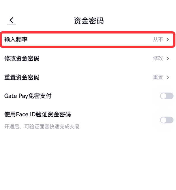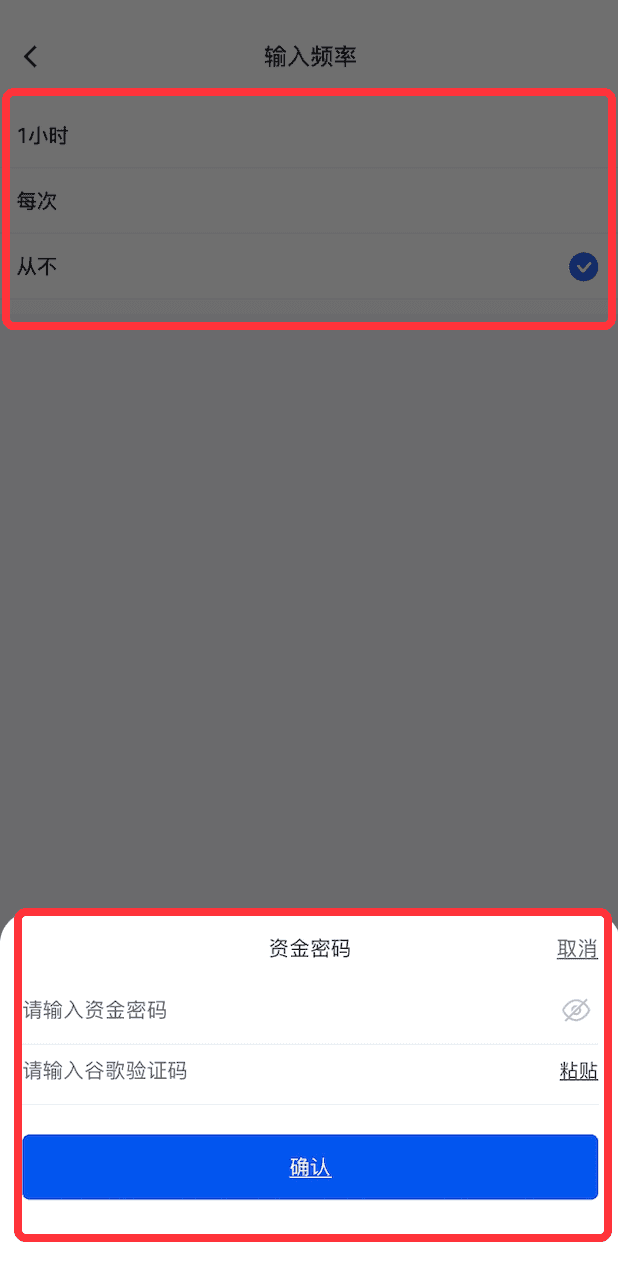 2、在“资金密码”页面,点击“输入频率”,可以自行选择资金密码输入频率(1小时/每次/从不),选择并进行安全验证后点击确认即可。