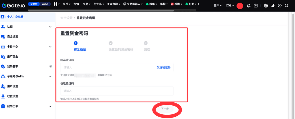 在重置资金密码界面,首先按照页面提示输入验证信息进行安全验证,完成后点击“下一步”,再按照页面提示输入新密码,完成后点击确认即可。