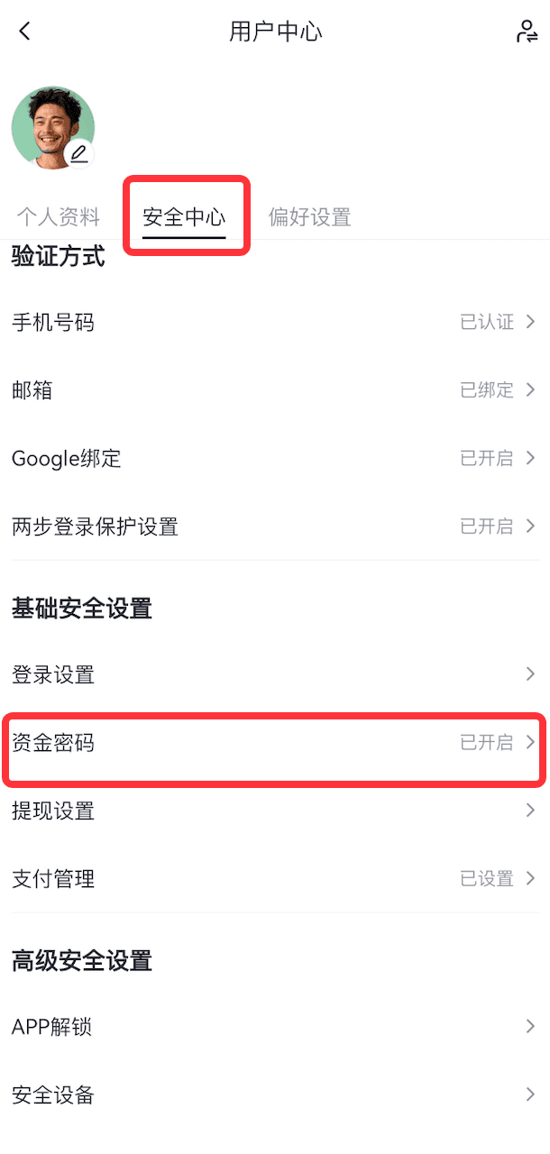 1、打开Gate手机App,登录个人账户,在APP首页点击左上角的“头像”进入左侧菜单栏,然后再次点击头像标识,进入用户中心界面,选择“安全中心”—“资金密码”—进入“资金密码”页面。