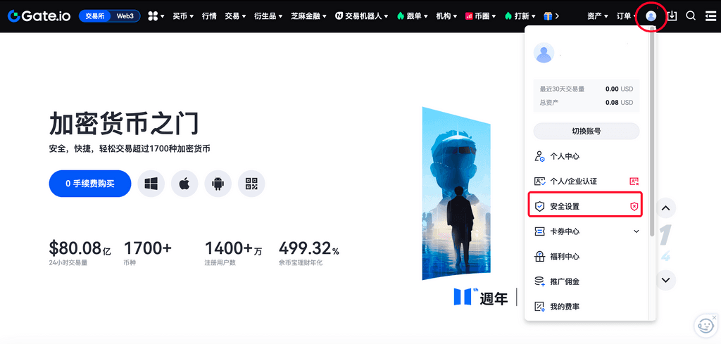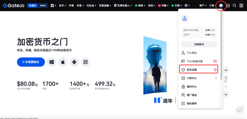 1、登录Gate个人账户,点击右上角“头像”,点击“安全设置”。