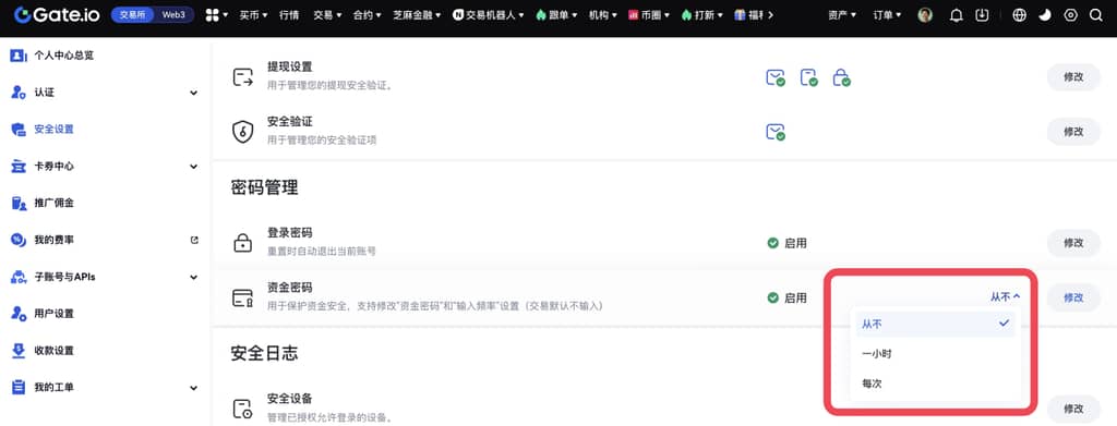 2、在安全设置页面下方的“密码管理”处,点击”资金密码”右侧的下拉箭头,可以自行选择资金密码输入频率(一小时/每次/从不)。