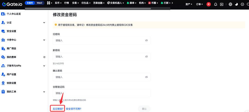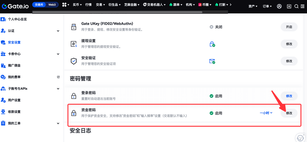 1、登录Gate个人账户,点击右上角“头像”——“安全设置”,进入安全设置页面,下拉页面至”密码管理”处,点击资金密码右侧“修改”-进入修改资金密码界面。