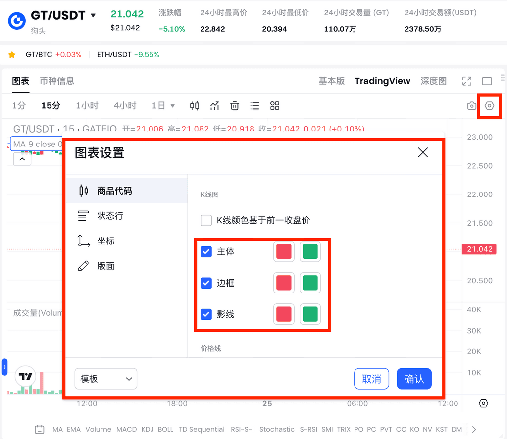 点击K线图上方“设置”,在弹出的设置页面中,勾选要更改的主体(边框,影线) 然后点击颜色方框就可以更改您K线颜色为其他颜色。