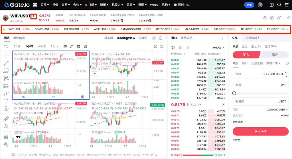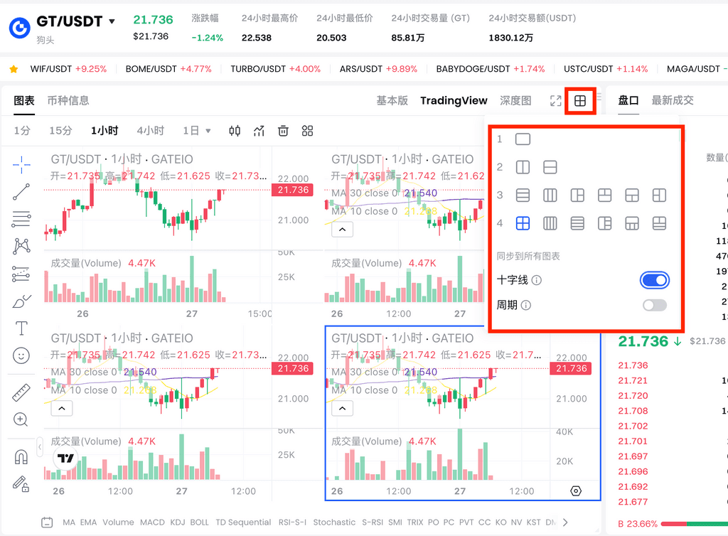 展开窗口后可在k线图顶部切换已设置四图的交易对;