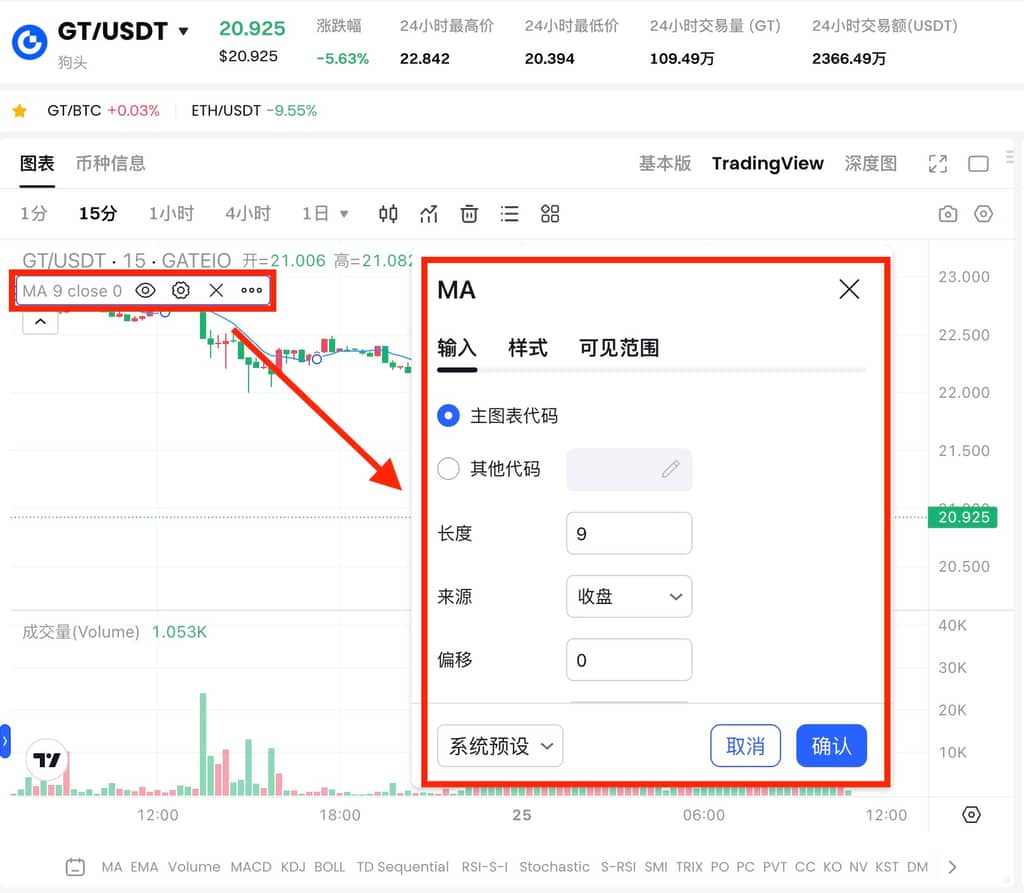 ②点击设置旁边“x”可以删除不需要的均线。